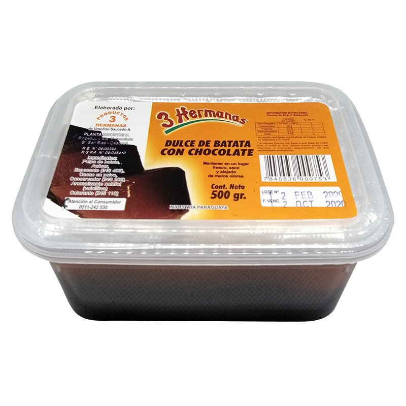 3 HERMANAS DULCE DE BATATA C/CHOCO ENV.PLAST.500GR