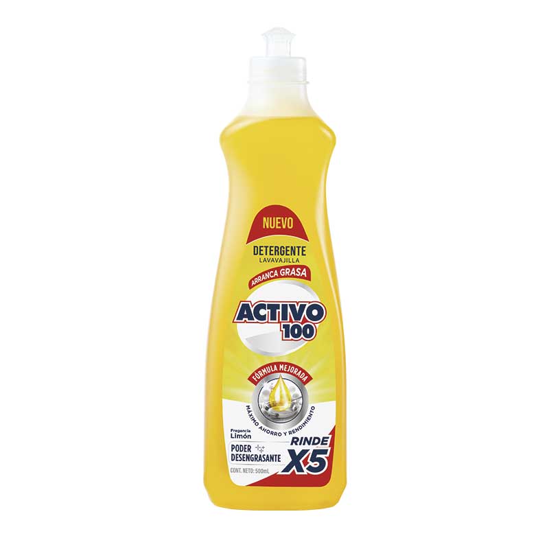 Inicio Catálogo de productos CUIDADO DEL HOGAR DETERGENTE LAVAVAJILLAS DETERGENTE ACTIVO 100 ARRANCA GRASA LIMÓN 500 ML